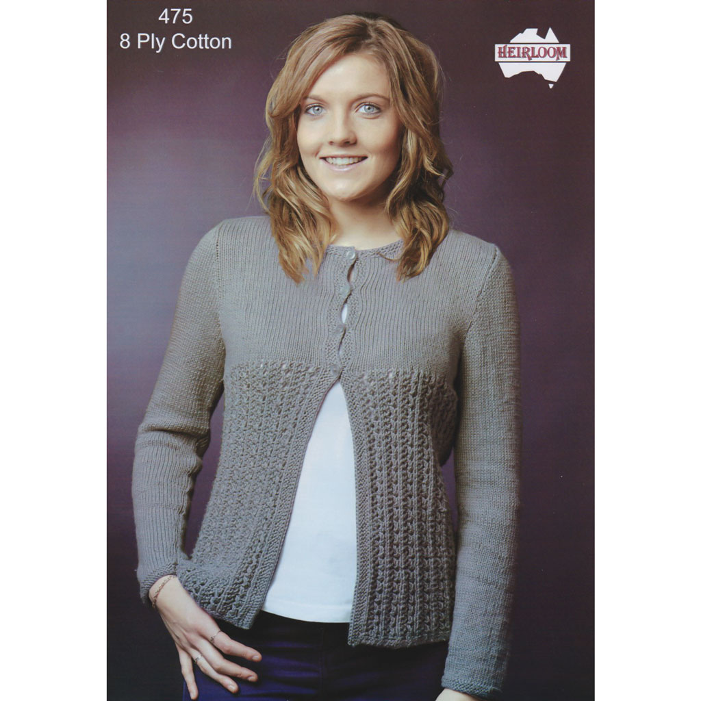Cardi for 8ply Cotton yarn in sizes from 70cm to 115cm chest.